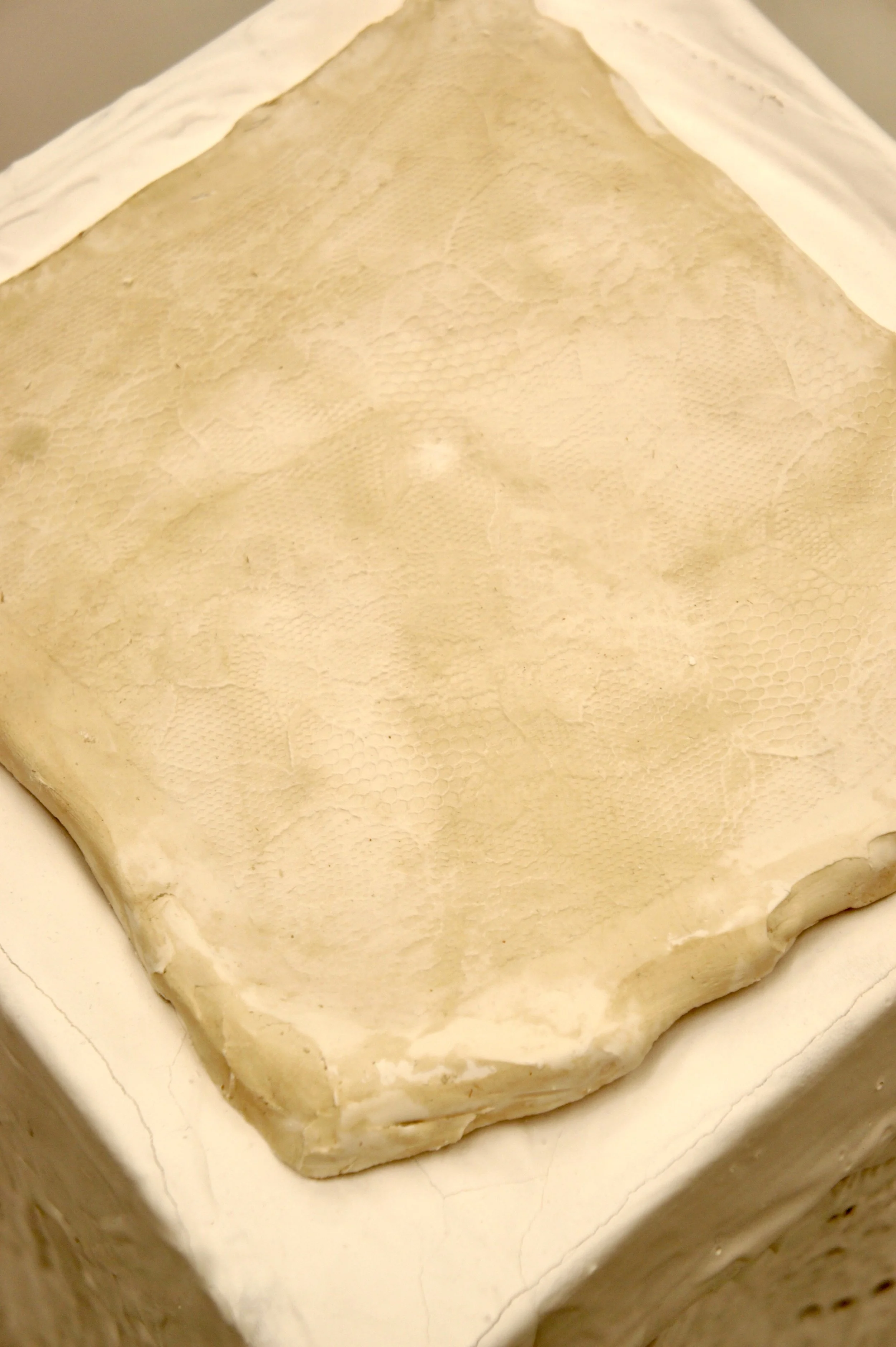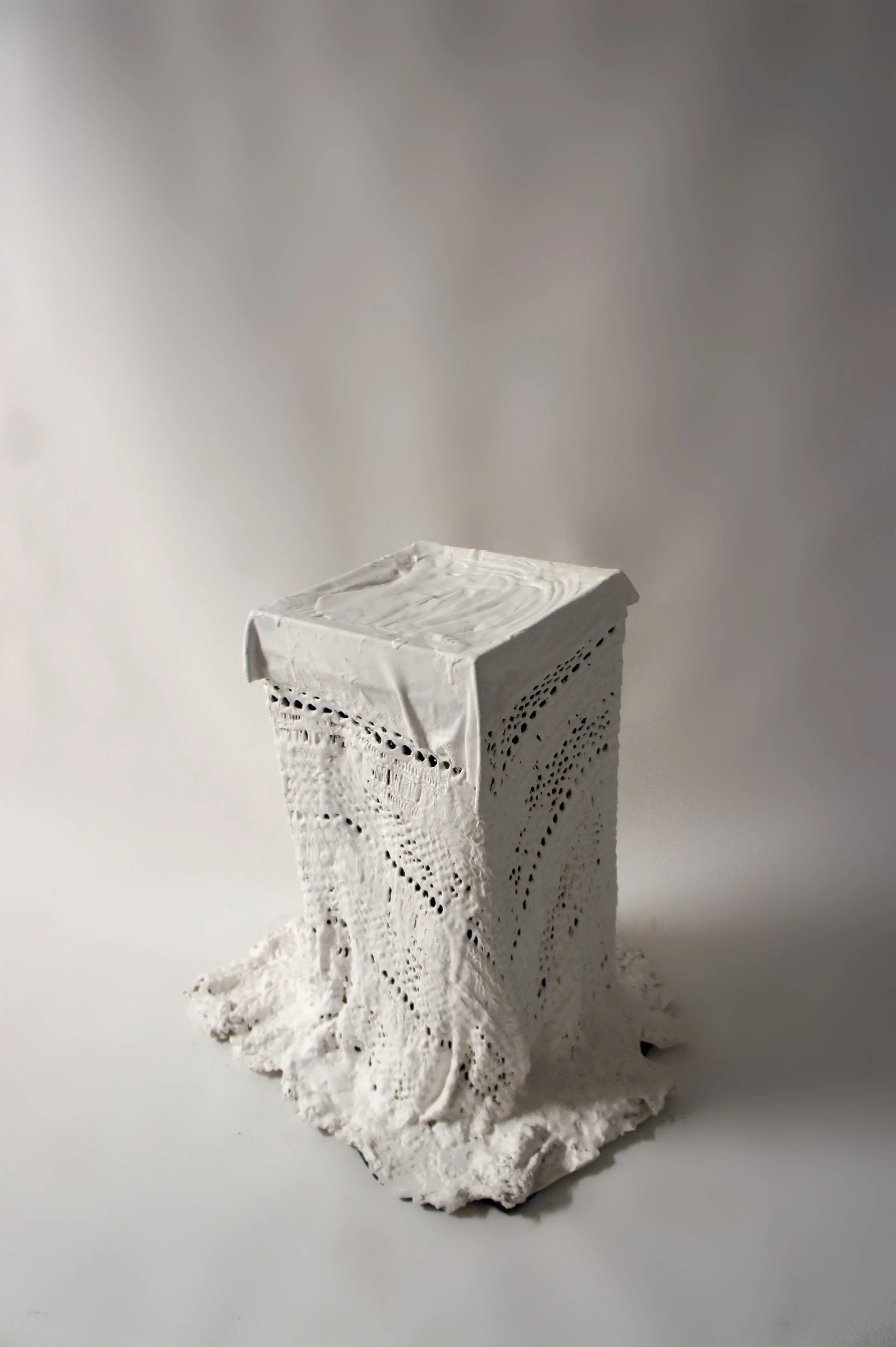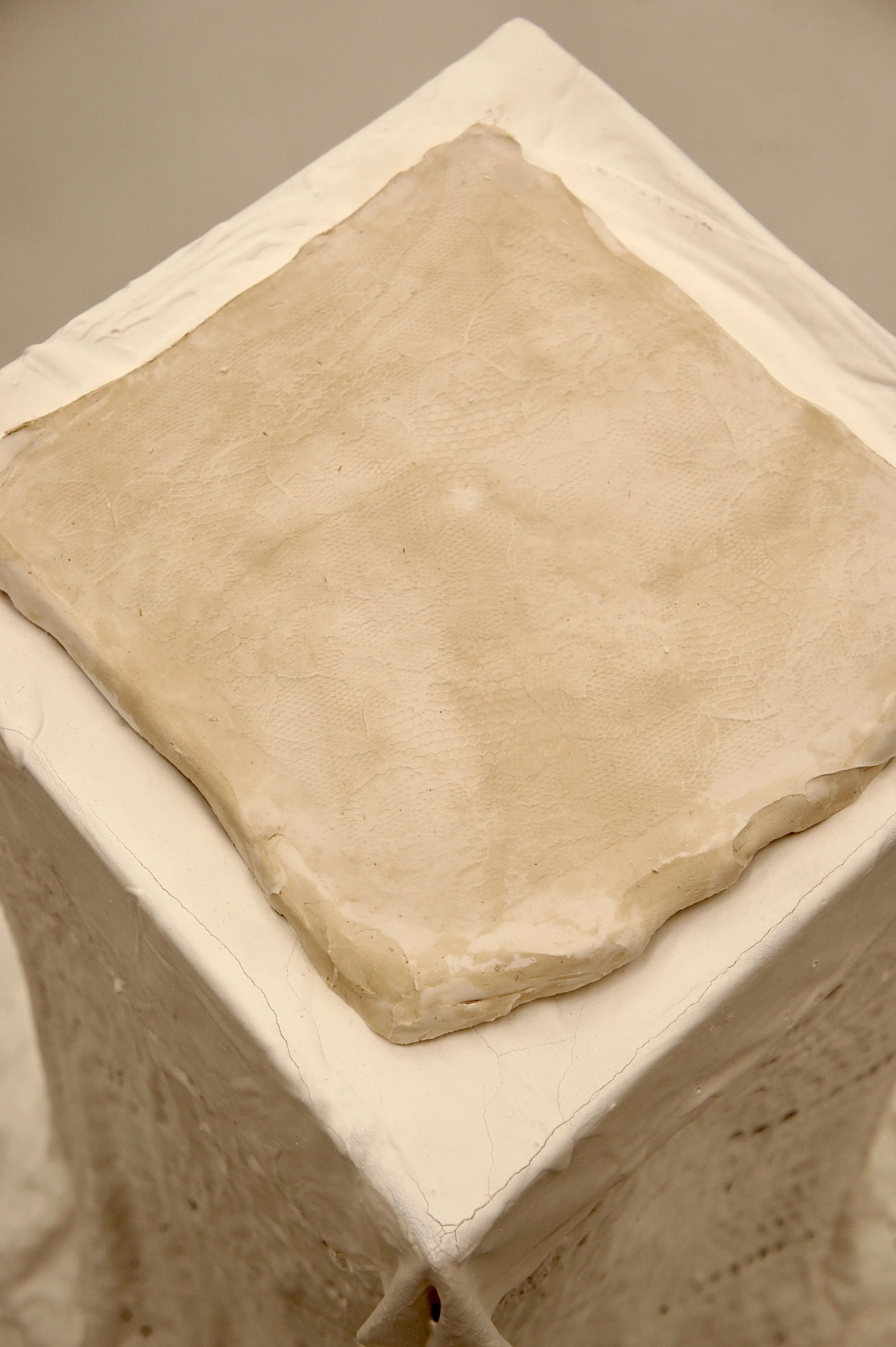 Experimenting with alginate casting of lace and crochet patterns, Feminine Relic 1 both immortalizes and paralyses traditionally feminine craft.