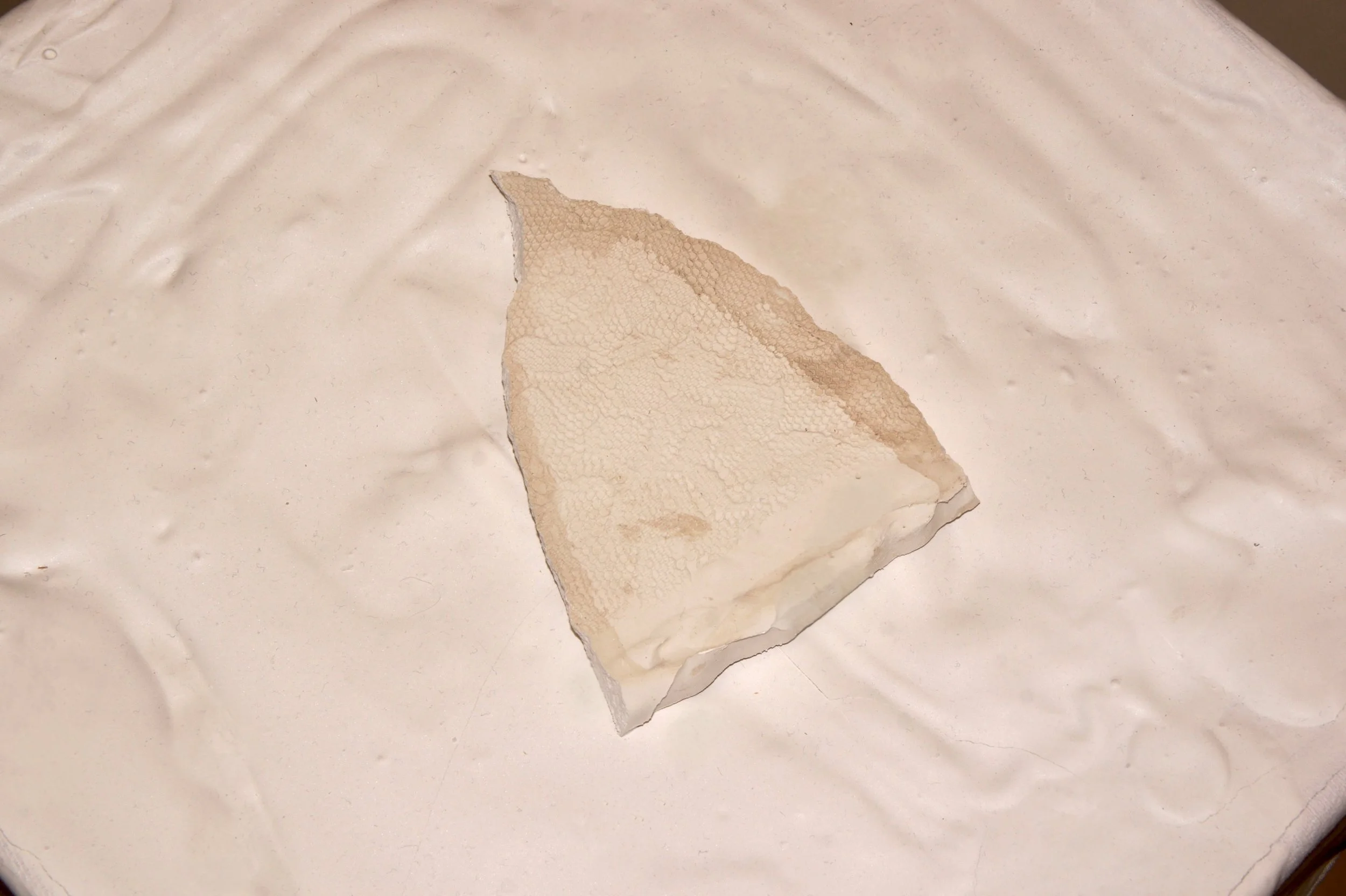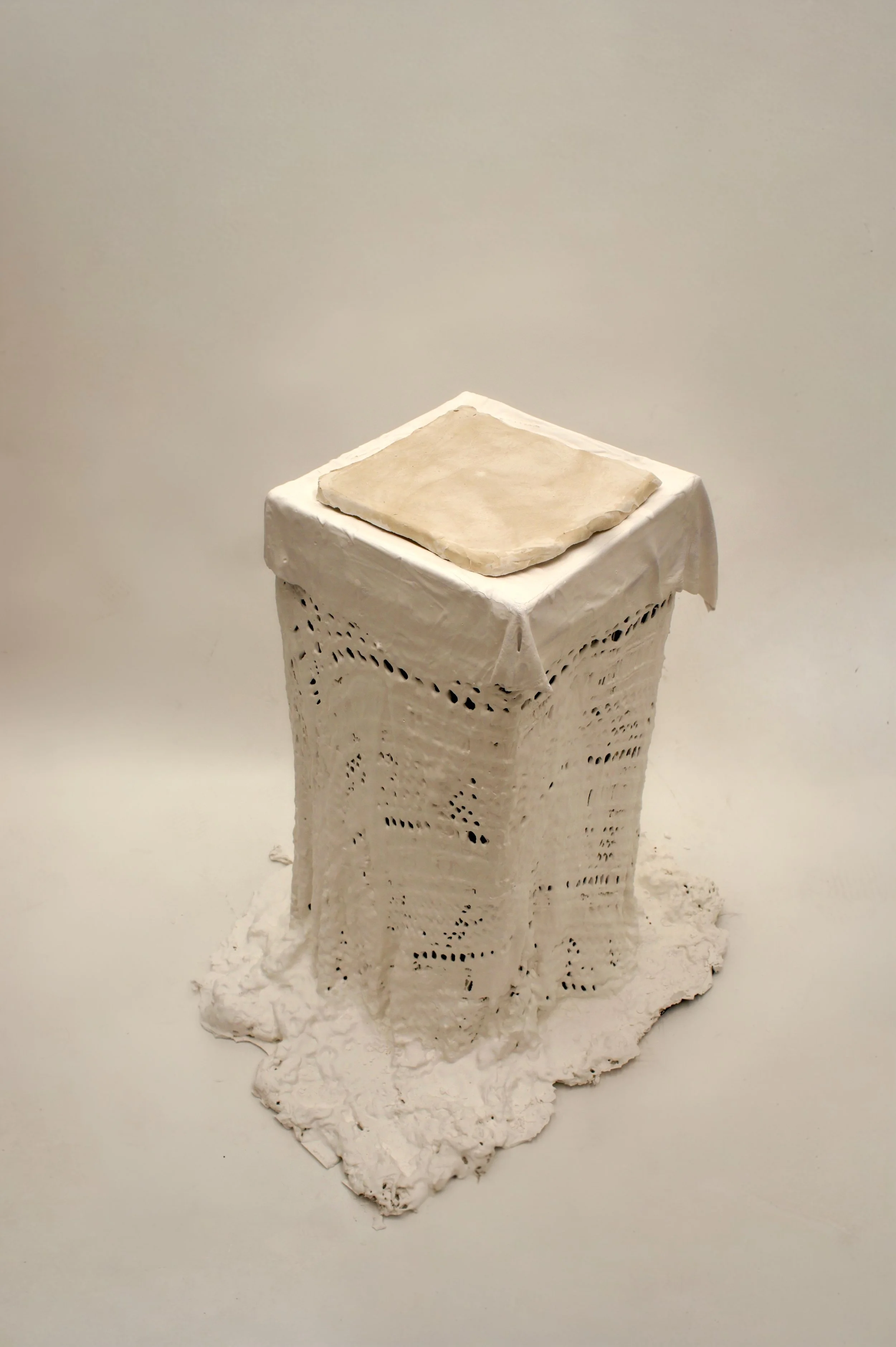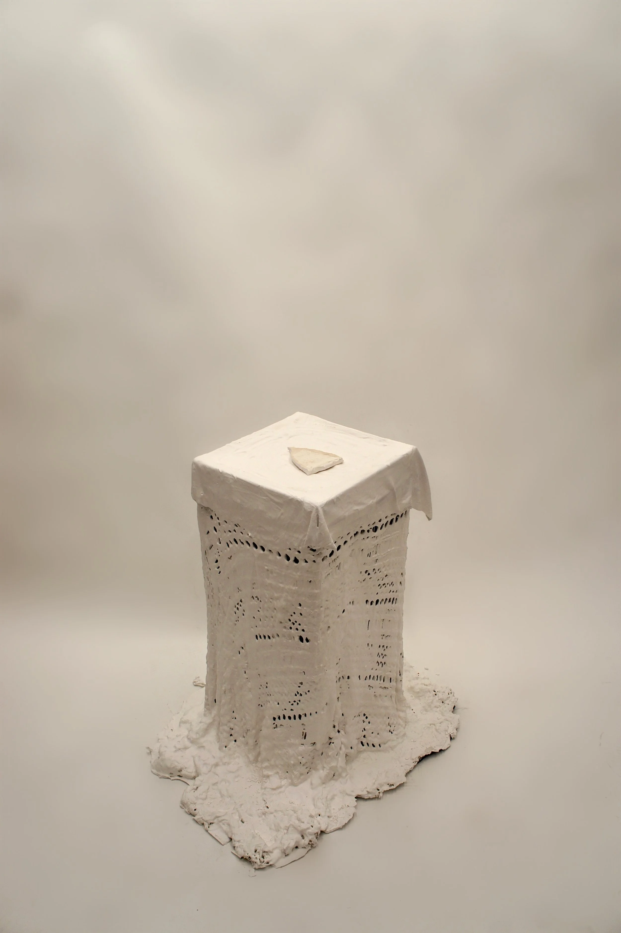 Experimenting with alginate casting of lace and crochet patterns, Feminine Relic 1 both immortalizes and paralyses traditionally feminine craft.