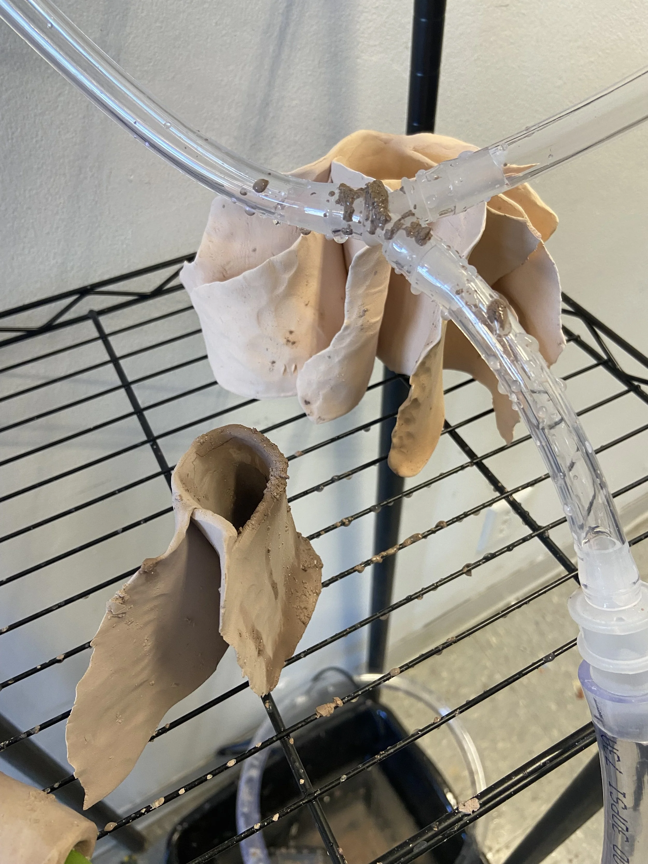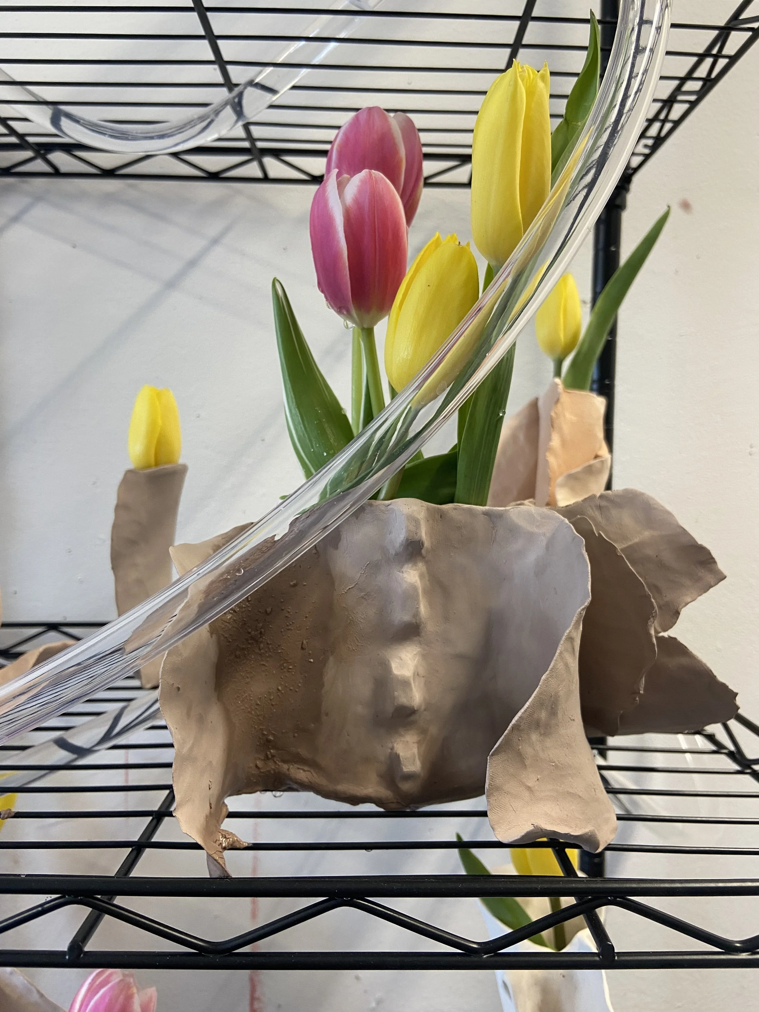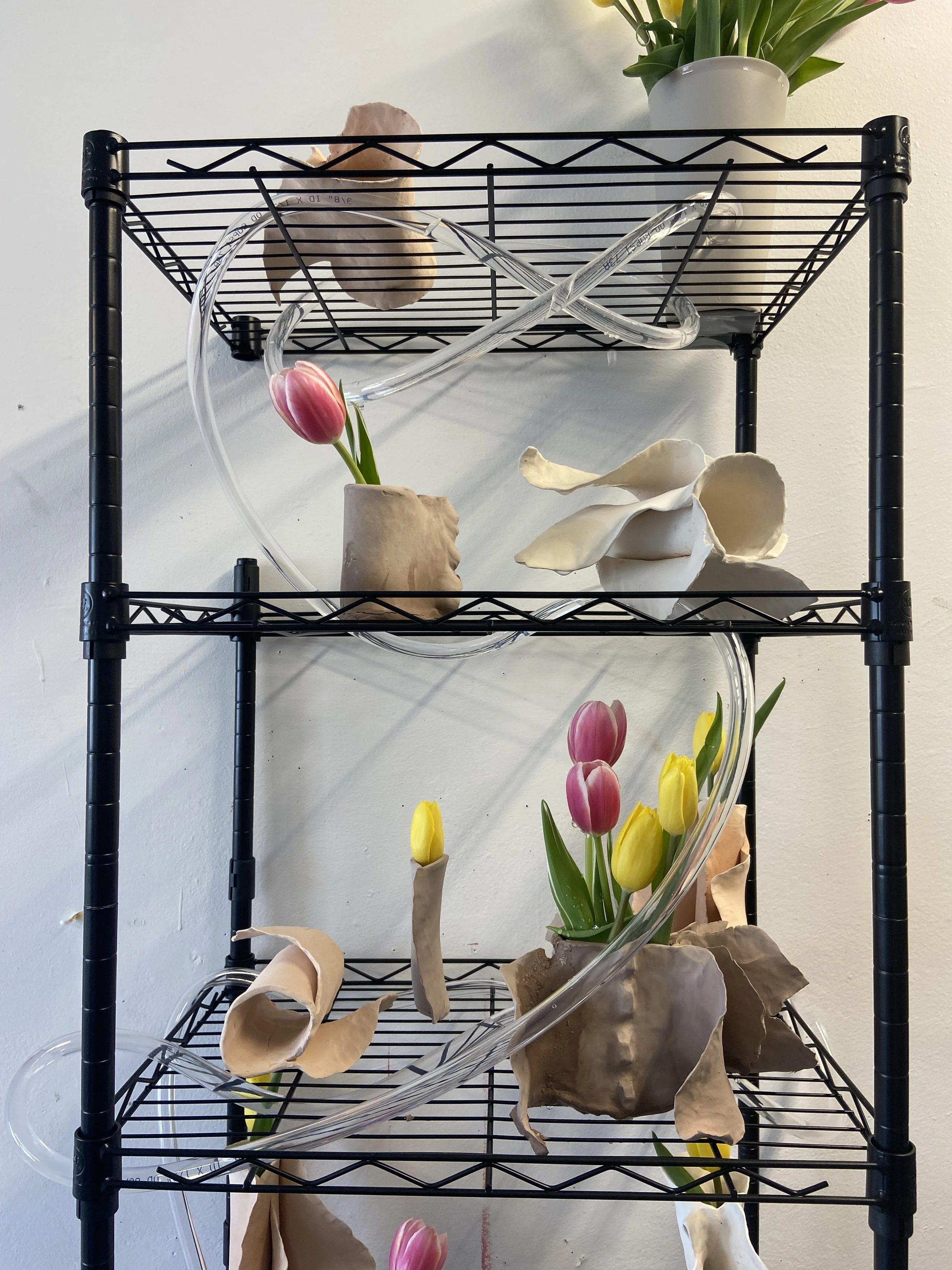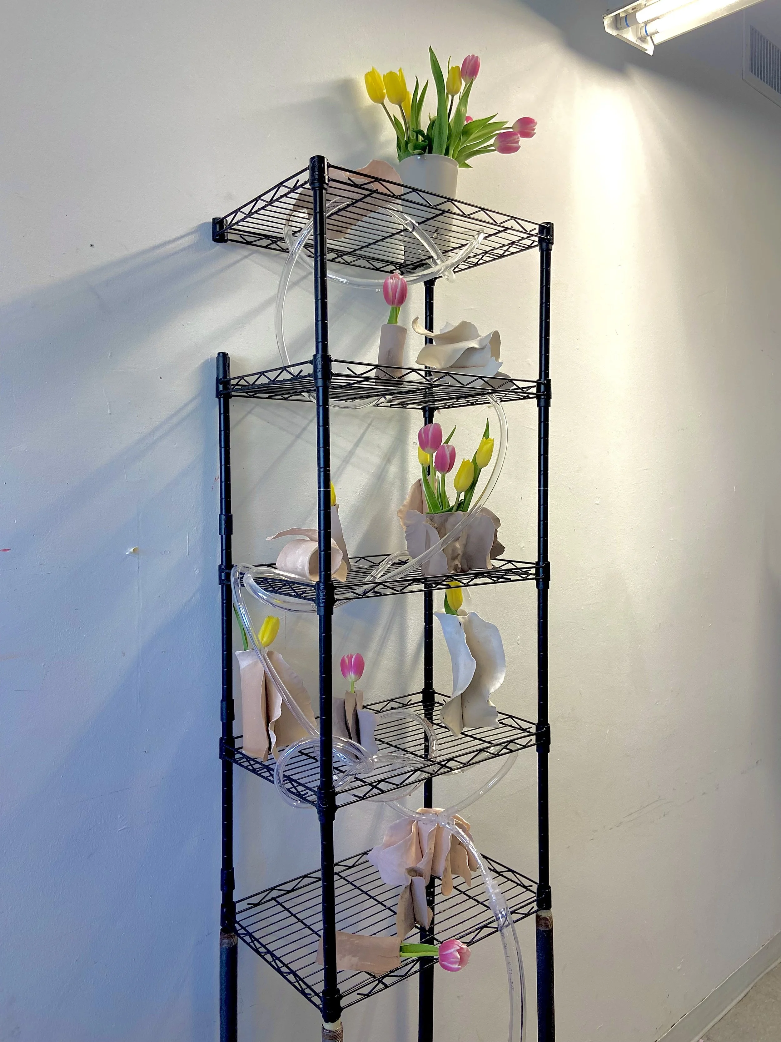 Fresh tulips, unfired and bisqued ceramic, steel shelving, plastic tubing, aquarium pump and basin (not pictured)