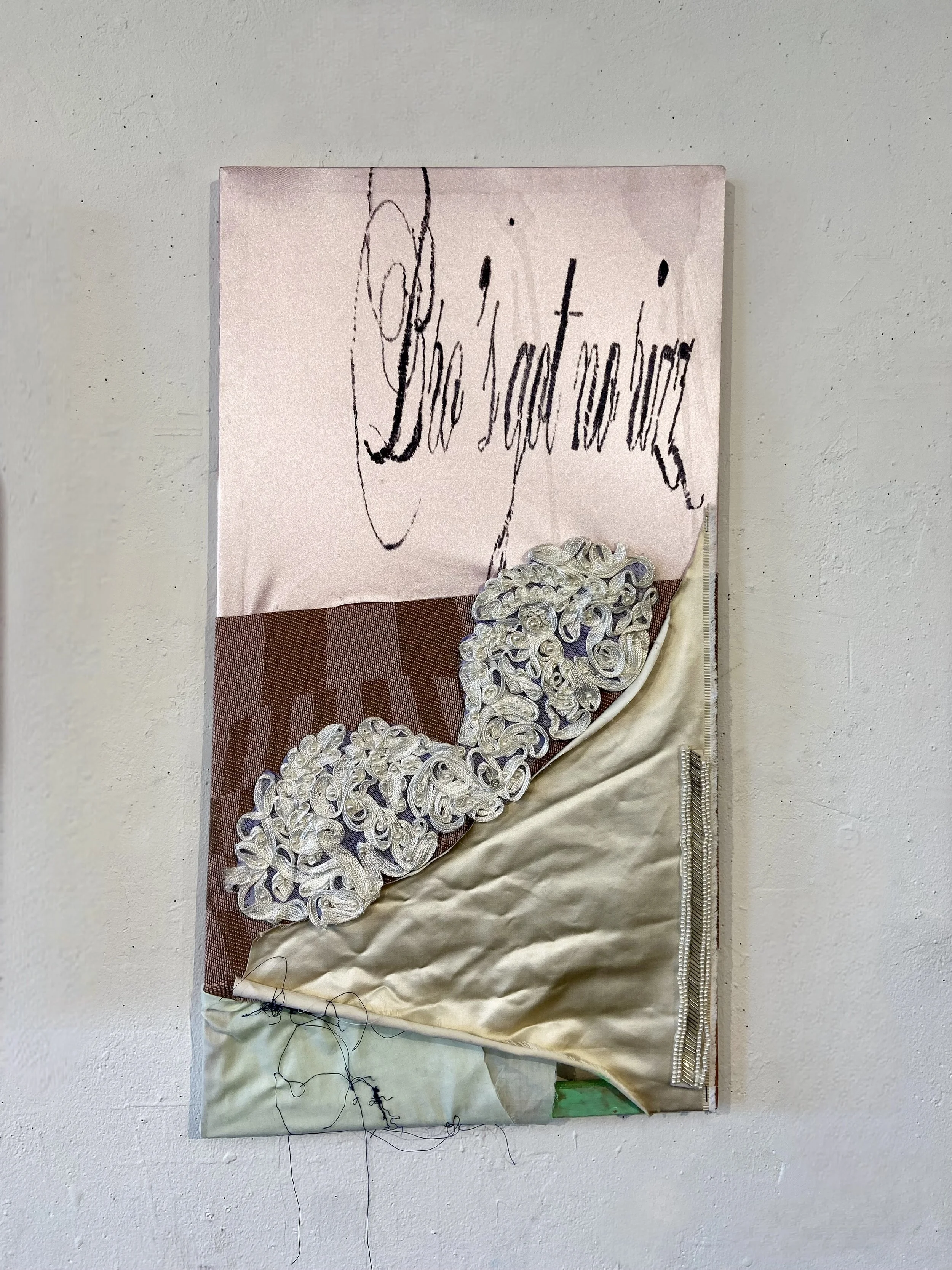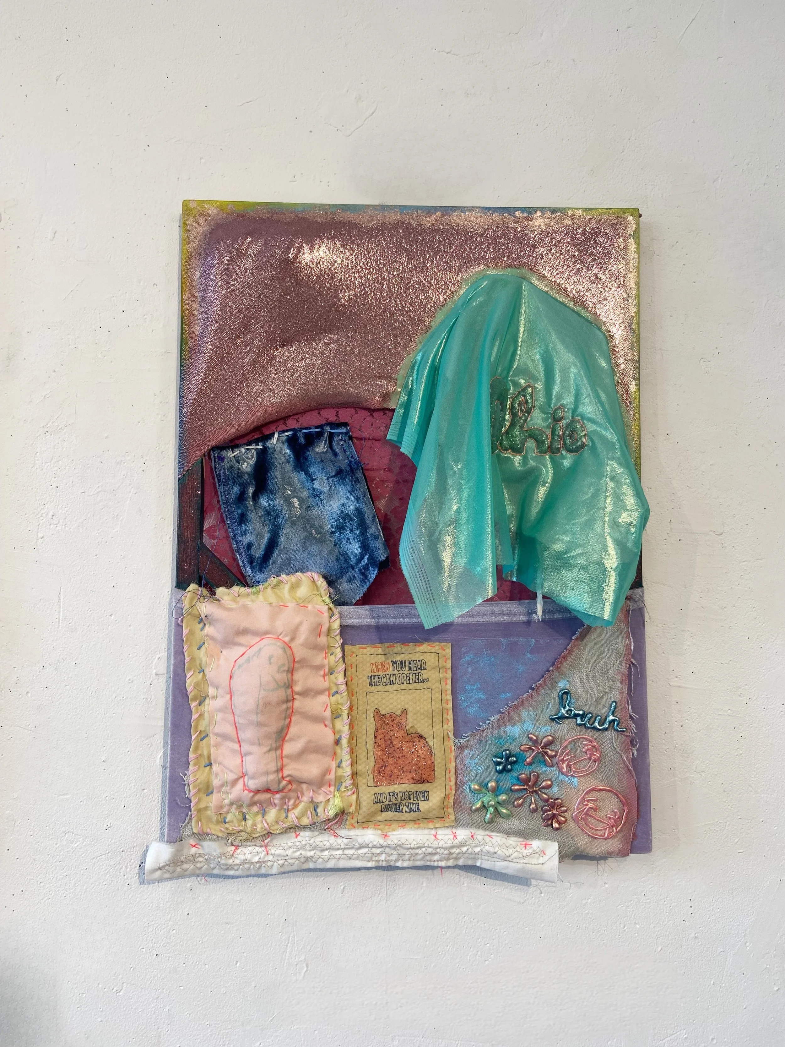 These Untitled Brainrot Experiments (1 through 3, respectively) were created in October of 2024. They consist of fabric and other materials stretched over wooden frames, questioning and challenging everything the artist finds uncomfortable about the meme content she sees while scrolling on the internet—male-centered, completely immaterial, and lacking texture.