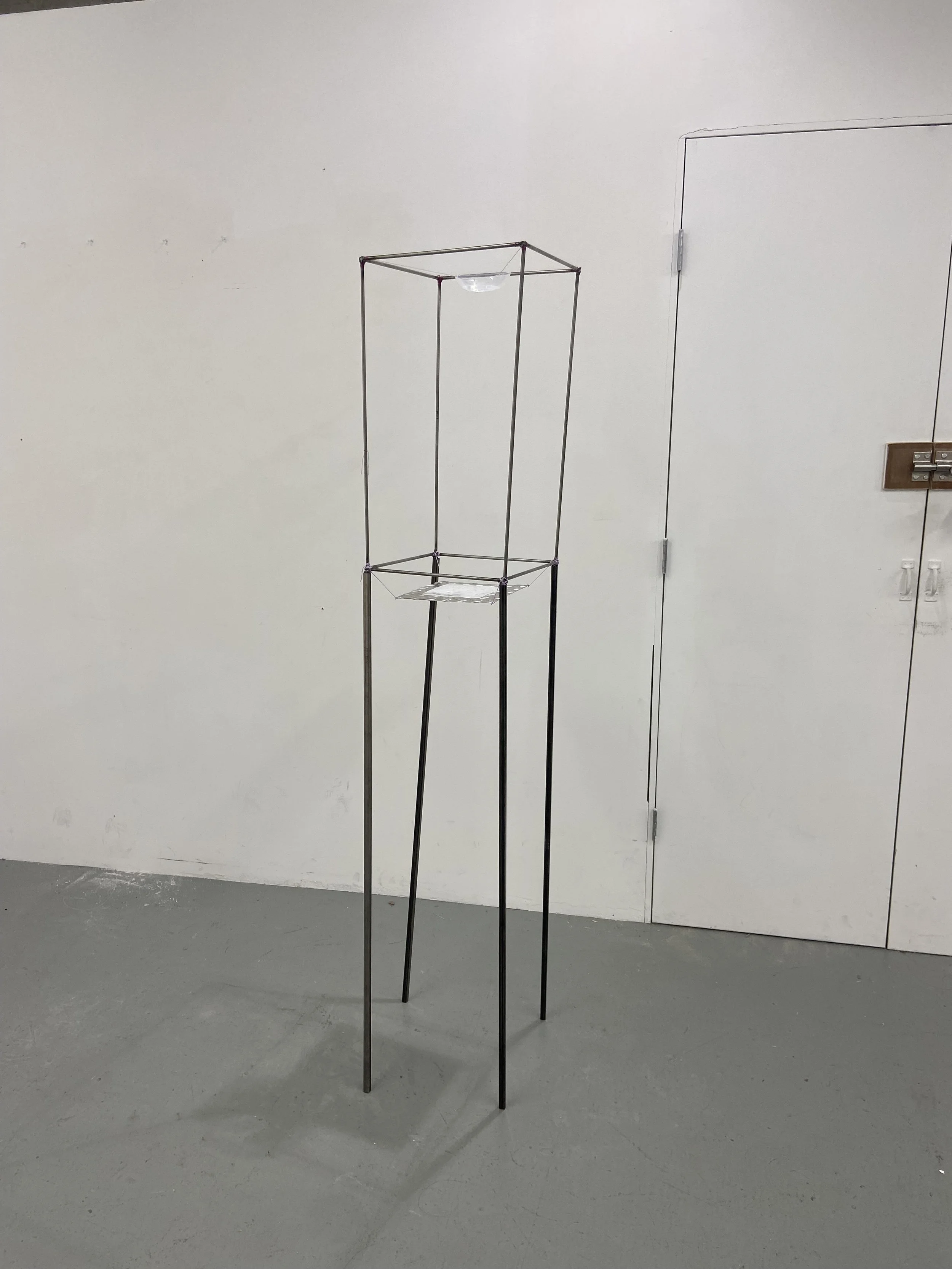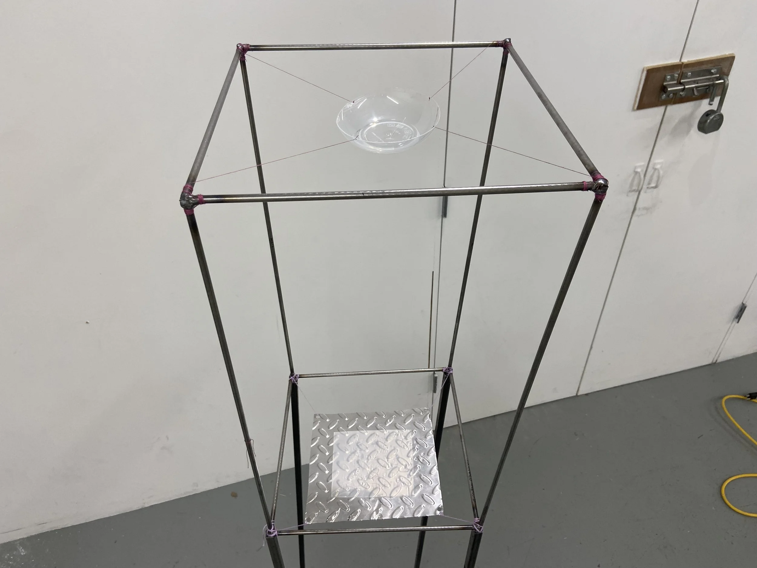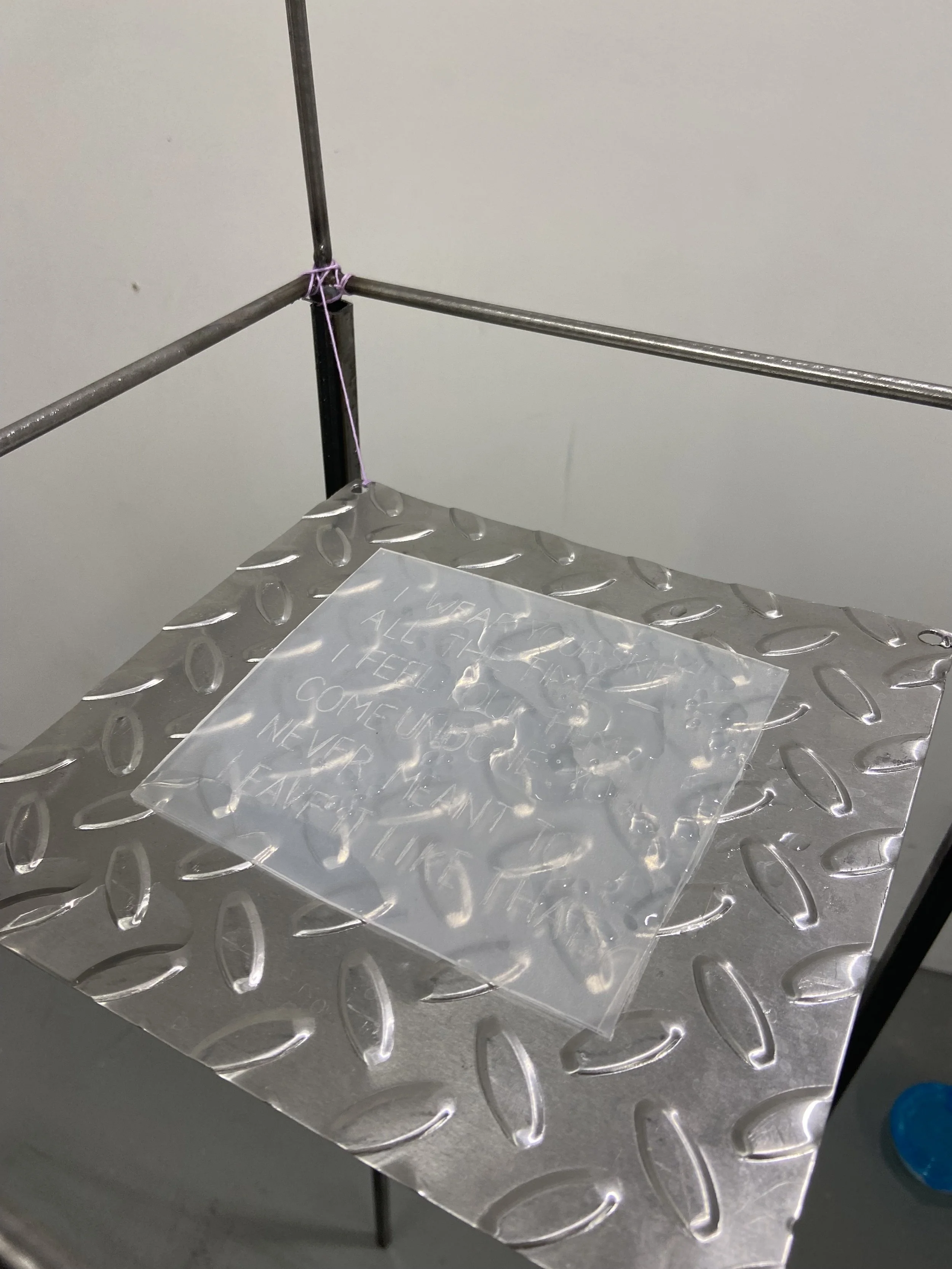 This is a steel sculpture that features a suspended plastic bowl and plastic plaque, featuring a poem engraved with a sewing needle. Water is poured every 10 minutes into the suspended bowl and drips onto the plaque, slowly obscuring the message.