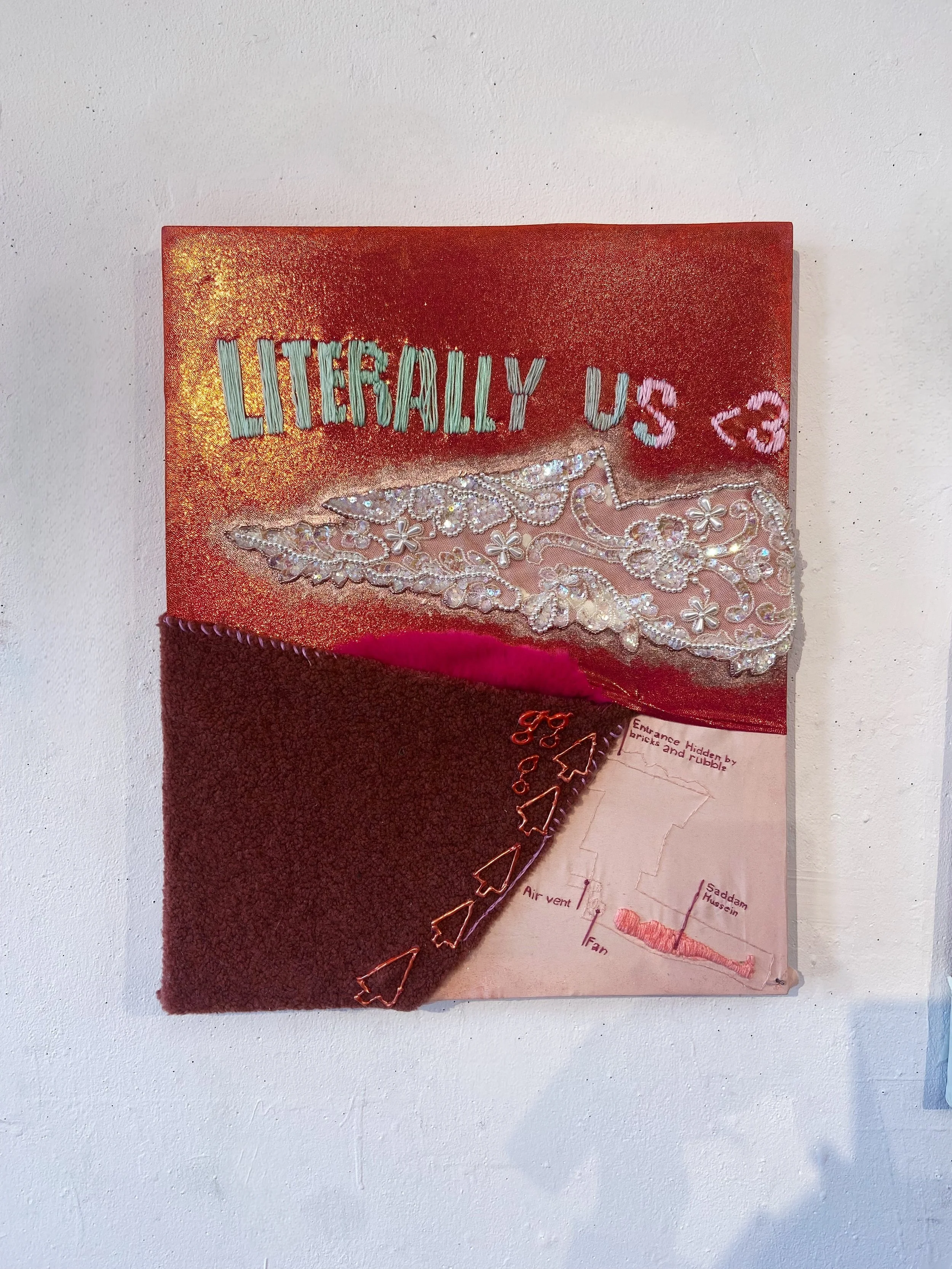 These experiments feature embroidery of obscure meme references such as “Saddam Hussein’s Hiding Spot”, post-ironic cat memes, as well as a quote from Baron Trump said to one of her friends on campus: “Bro’s got no Rizz.”