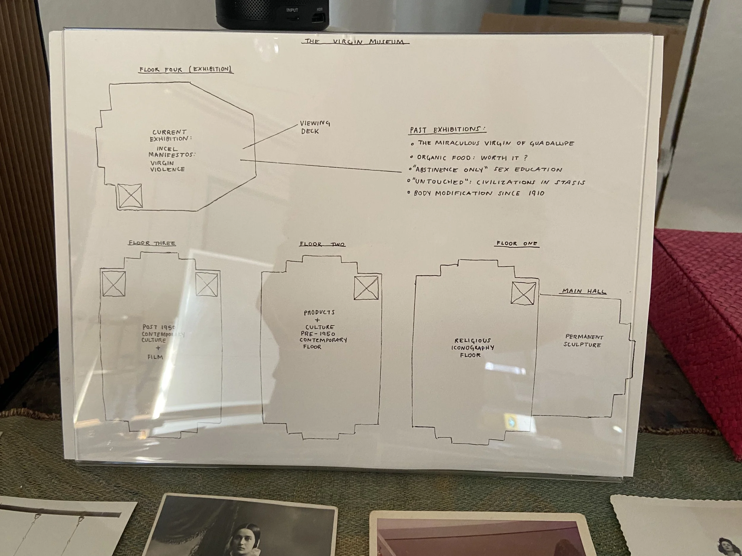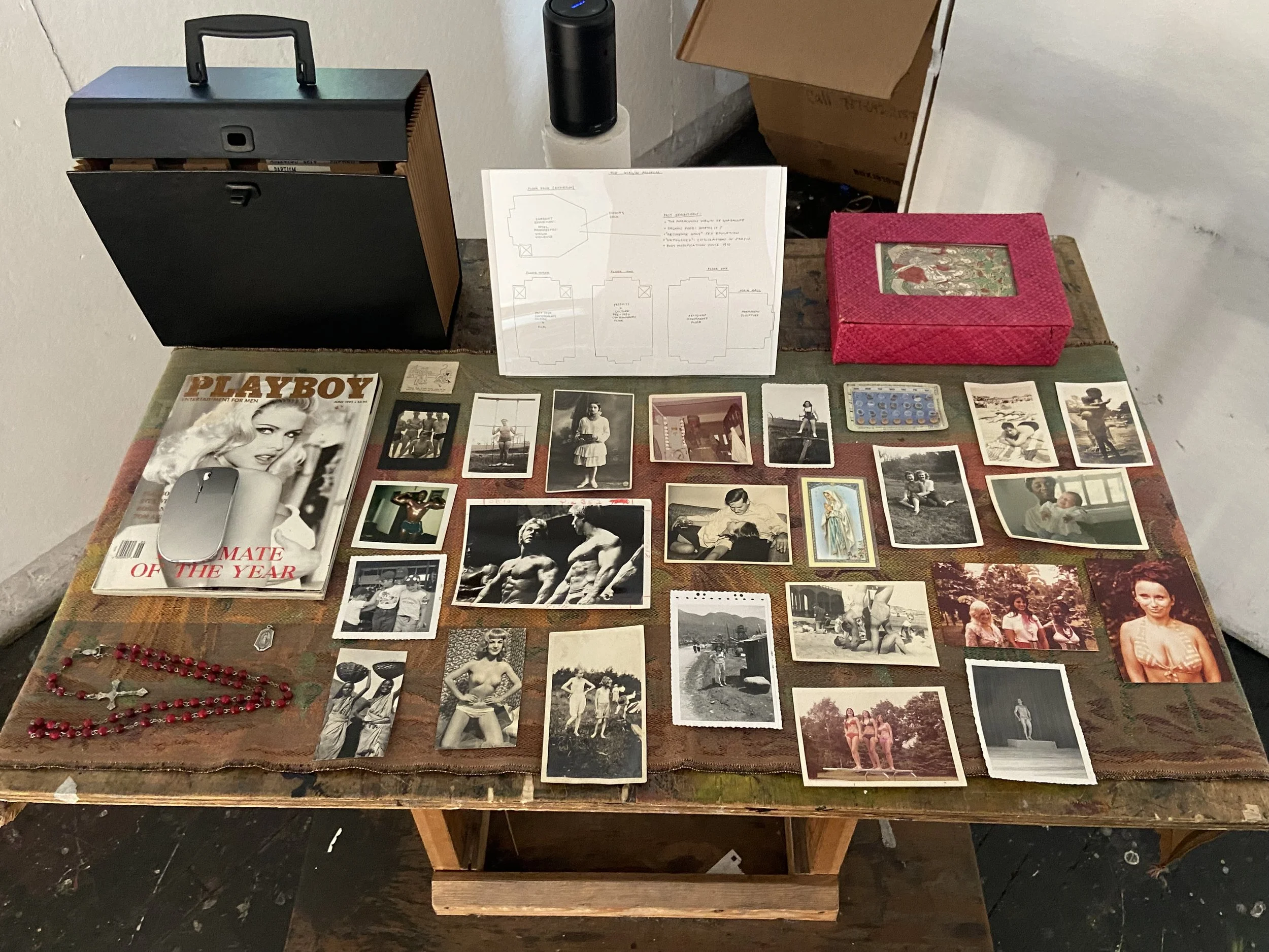 Two-channel video, interactive projection of Roger’s 137 page manifesto, ‘physical archive’ table including vintage photos of young Americans, a diagram of the ‘museum’ and a labeled archive box.